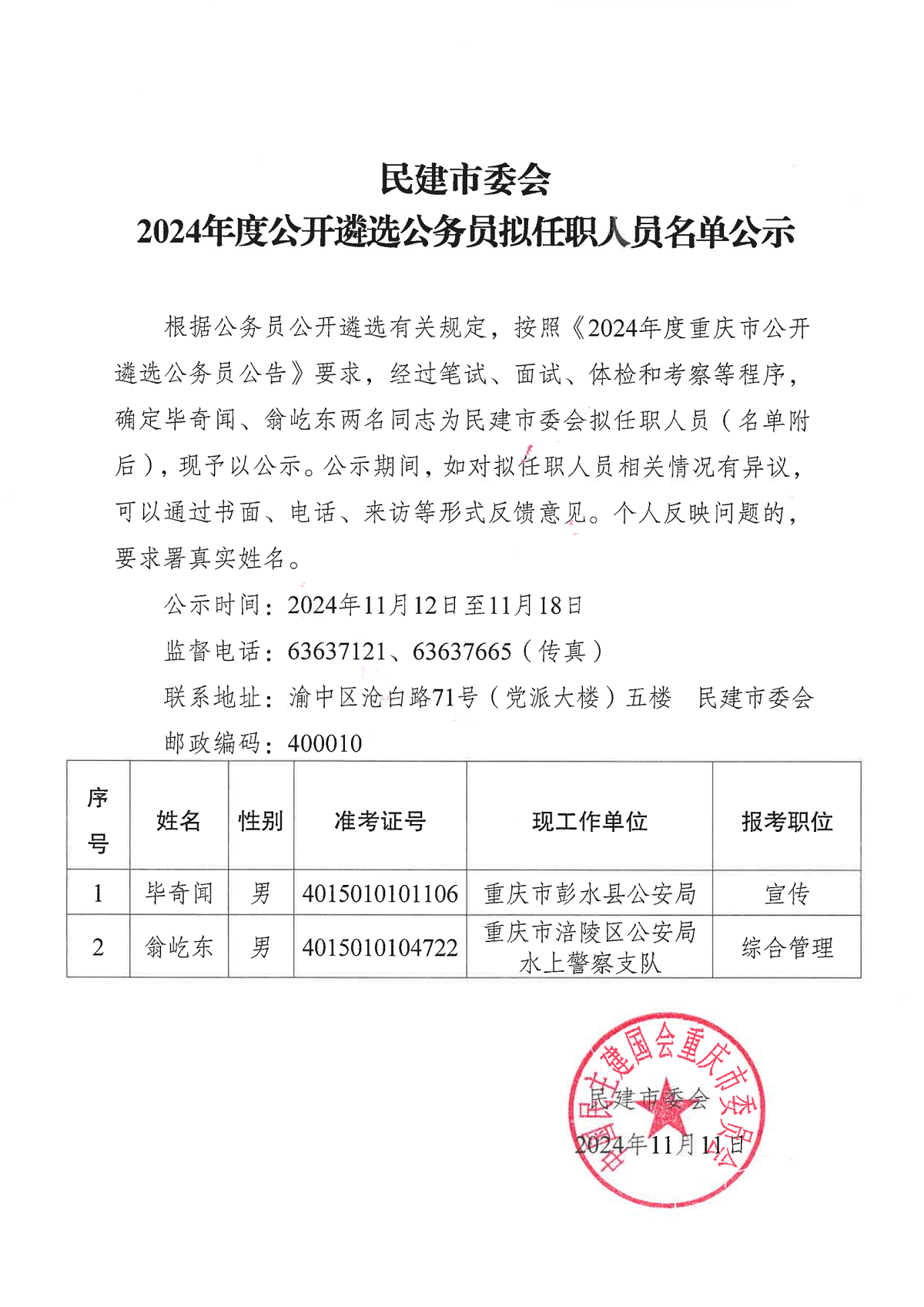 中国民主建国会重庆市委员会-民建市委会2024年度公开遴选公务员拟任职人员名单公示